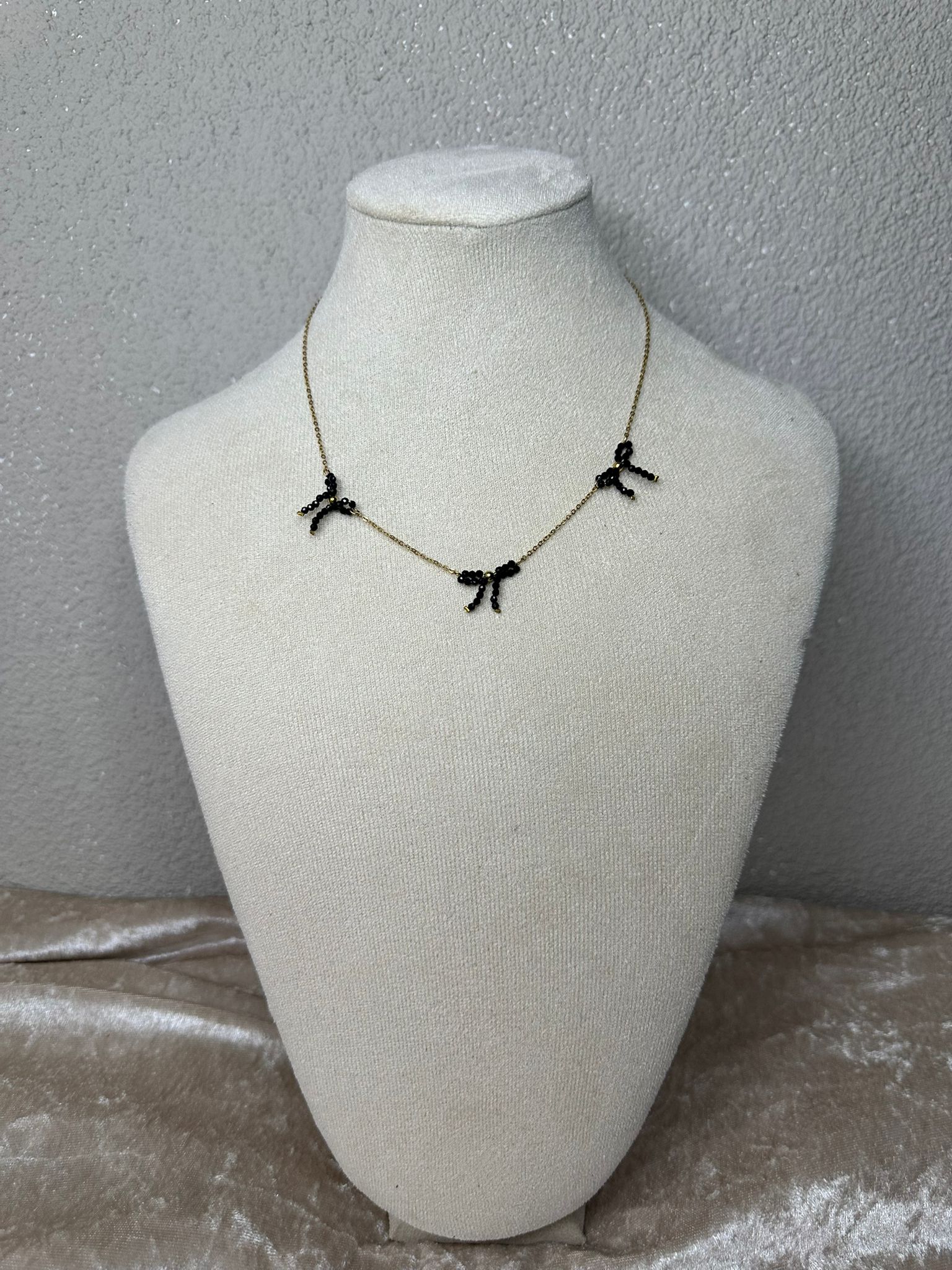 De Beaded Bow ketting is een sieraad dat een opvallende hanger is met een ketting van glasparels, wat zorgt voor een elegante en speelse uitstraling.