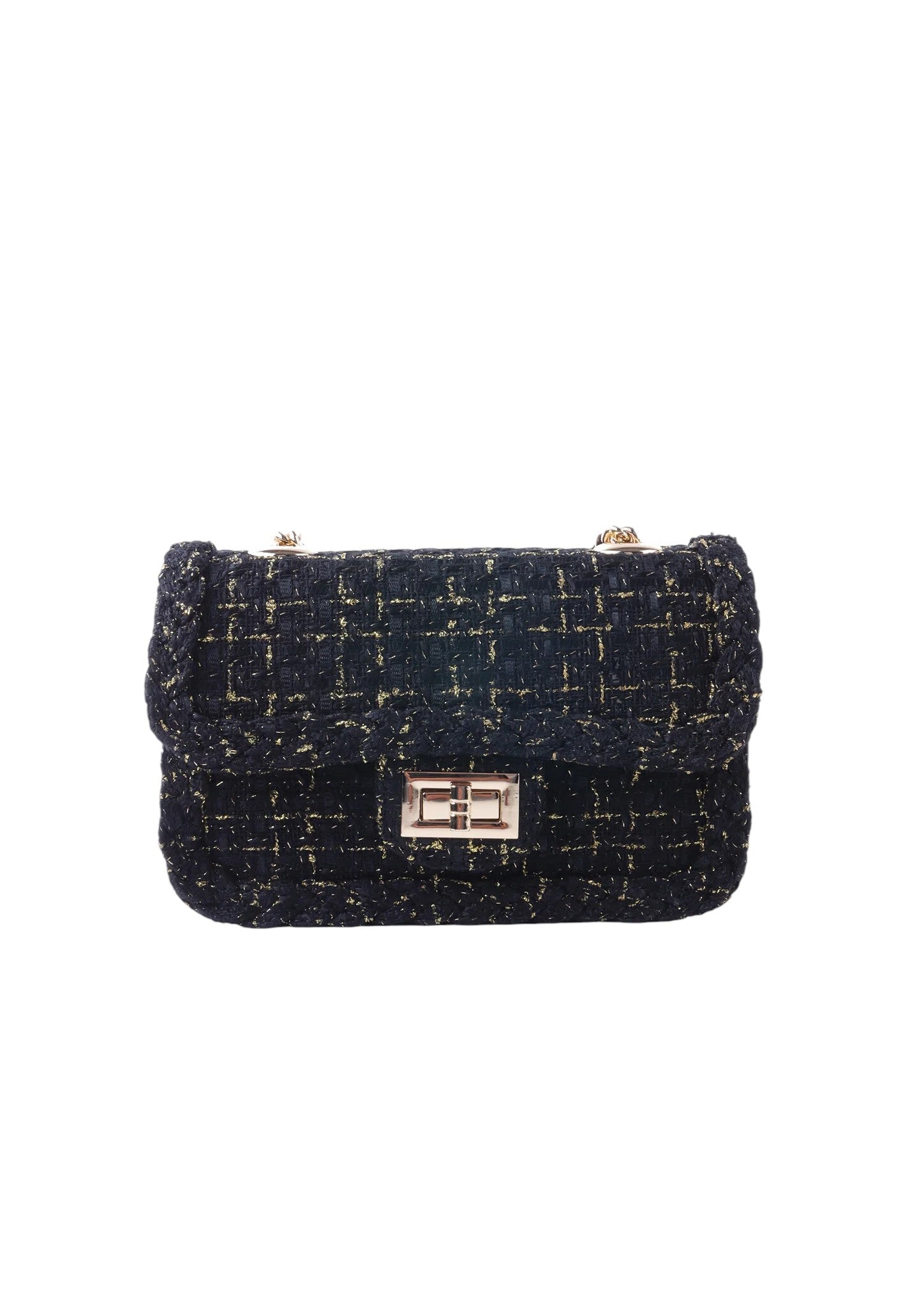 Een tas die klasse uitstraalt: zwarte tweed met sprankelende goudaccenten, afgewerkt met een glanzende kettingriem en verfijnde draaiclosure. Deze eyecatcher tilt je look moeiteloos naar een hoger niveau, van casual chic tot avond vol glamour.