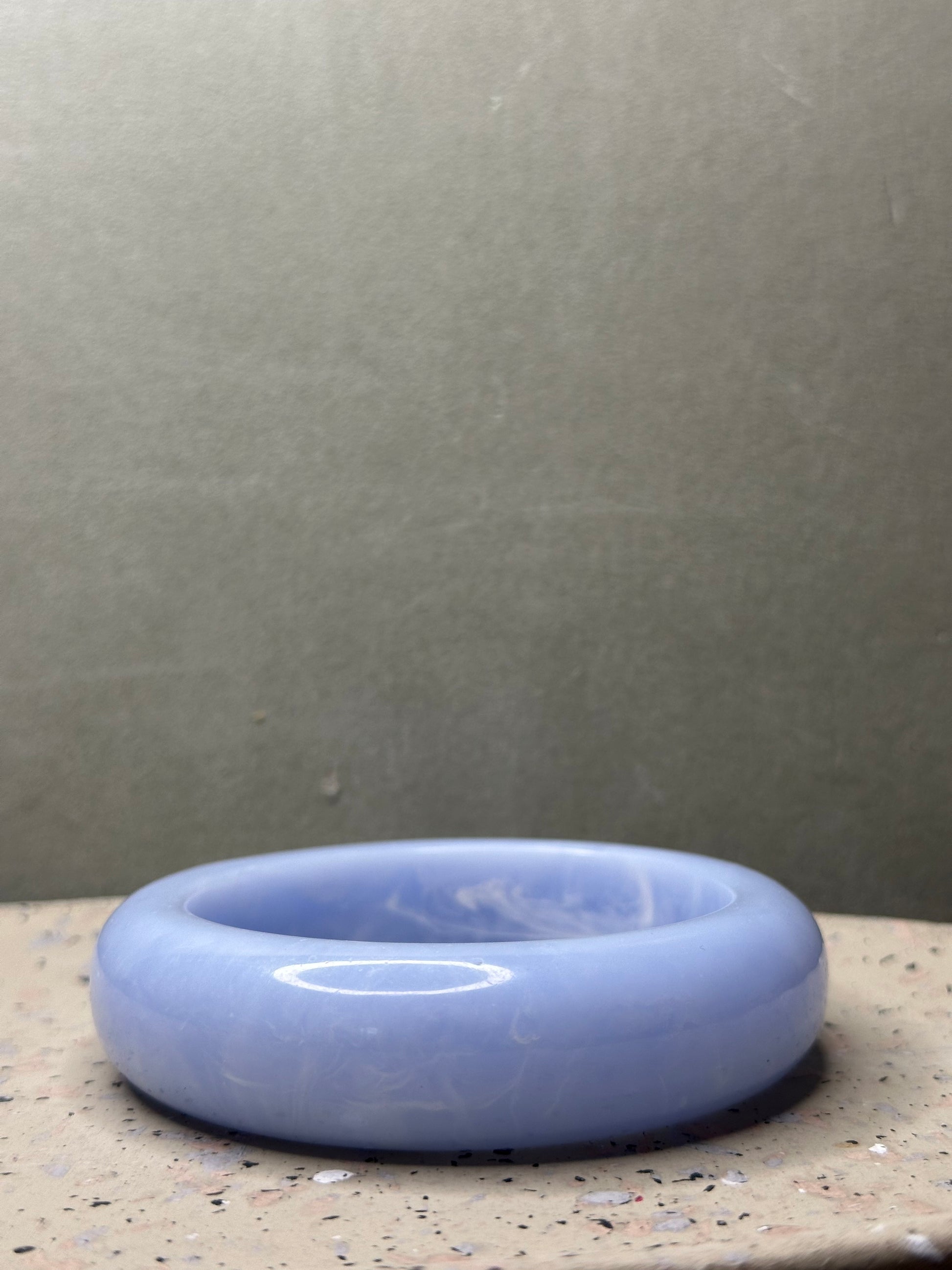 Deze elegante, lichtblauwe armband is gemaakt van hoogwaardig hars en heeft een glad, glanzend oppervlak met subtiele wolkachtige patronen. De brede, ronde vorm geeft een moderne en stijlvolle uitstraling, perfect om solo te dragen of te combineren met andere sieraden.