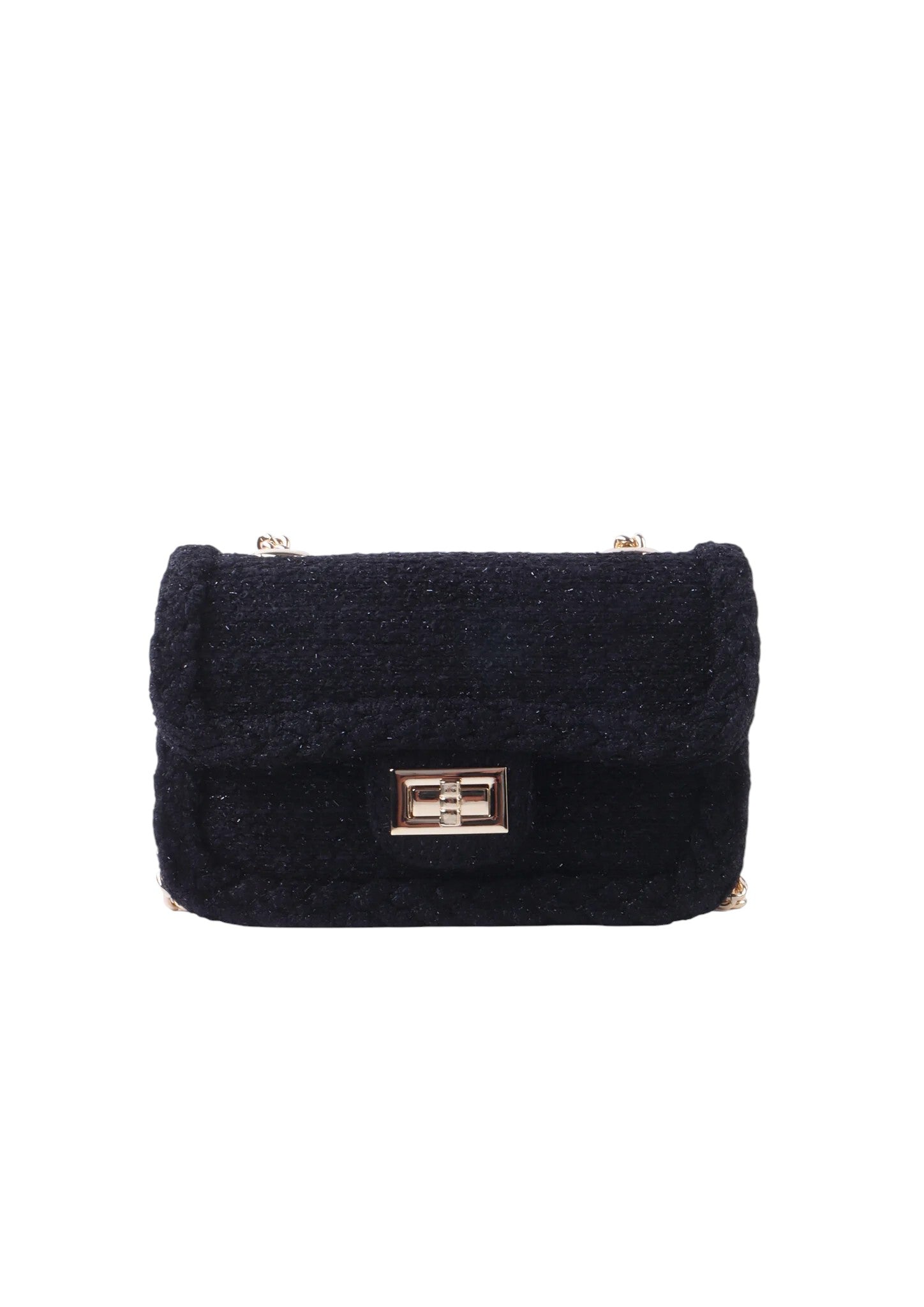 "Stijlvolle schoudertas in klassieke zwarte tweed-stijl, afgewerkt met een goudkleurige kettingriem en elegante draaiclosure. De perfecte combinatie van tijdloze klasse en moderne finesse – ideaal voor zowel dagelijks gebruik als een chique avondlook."